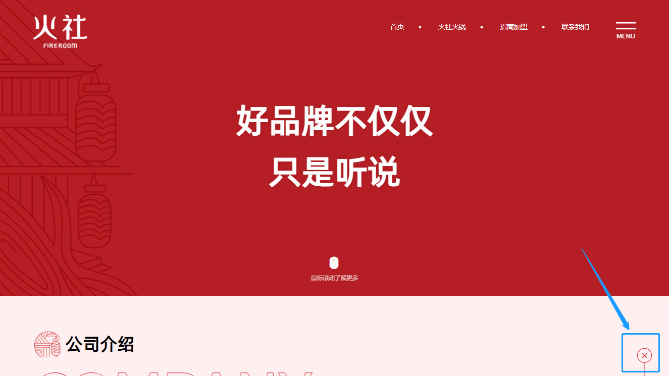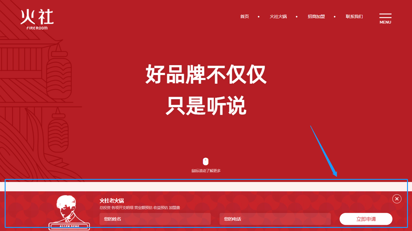 (愛(ài)蜀美極度注重用戶瀏覽網(wǎng)頁(yè)的舒適度和不被打擾性,非常反感一些營(yíng)銷工具的強(qiáng)制彈窗、反復(fù)彈出、狗皮膏藥似的占滿屏幕的四周,只保留必要的咨詢通道。所以我們只在網(wǎng)頁(yè)底部加入了一個(gè)加盟窗口,用戶可以隨時(shí)收縮/打開(kāi)窗口,在尊重用戶體驗(yàn)感的情況下,也體現(xiàn)了火社火鍋把服務(wù)放在首位的品牌理念↑)