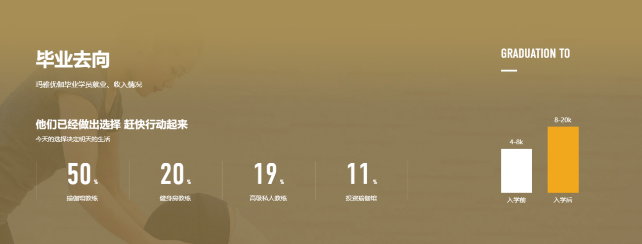 瑪雅瑜伽除了針對學(xué)員,其本身還是體育總部全國健身瑜伽指導(dǎo)委西南區(qū)官方指定考點(diǎn),也是目前西南區(qū)國家機(jī)構(gòu)唯一指定授權(quán)的瑜伽教練培訓(xùn)學(xué)校,為眾多瑜伽教練提供考證服務(wù),對于這部分用戶關(guān)注的從業(yè)方向、收入情況等我們也在首頁通過數(shù)據(jù)進(jìn)行了直觀展示,提升這部分用戶的信心的同時(shí)也促進(jìn)轉(zhuǎn)化率。